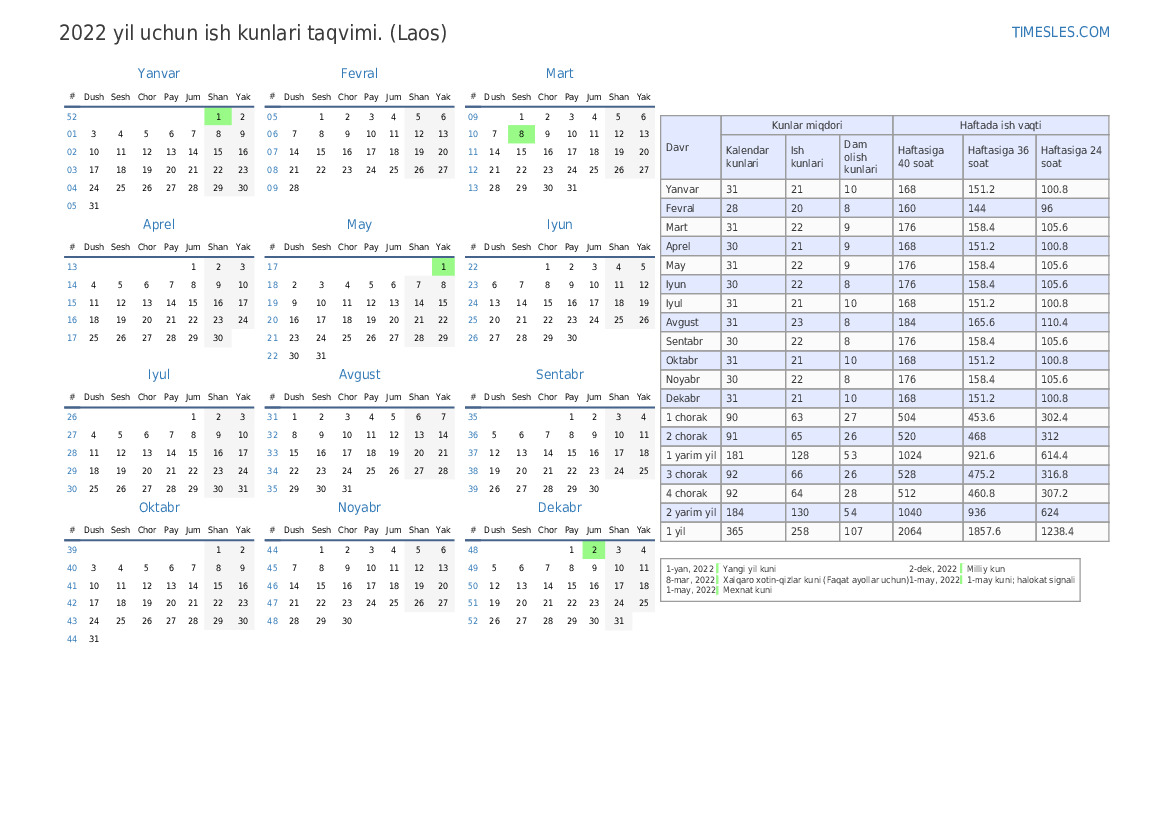 Laos uchun 2022 yil 3-choragi uchun ta'til va dam olish kunlari bilan PDF ish kunlari taqvimini yuklab oling va chop eting