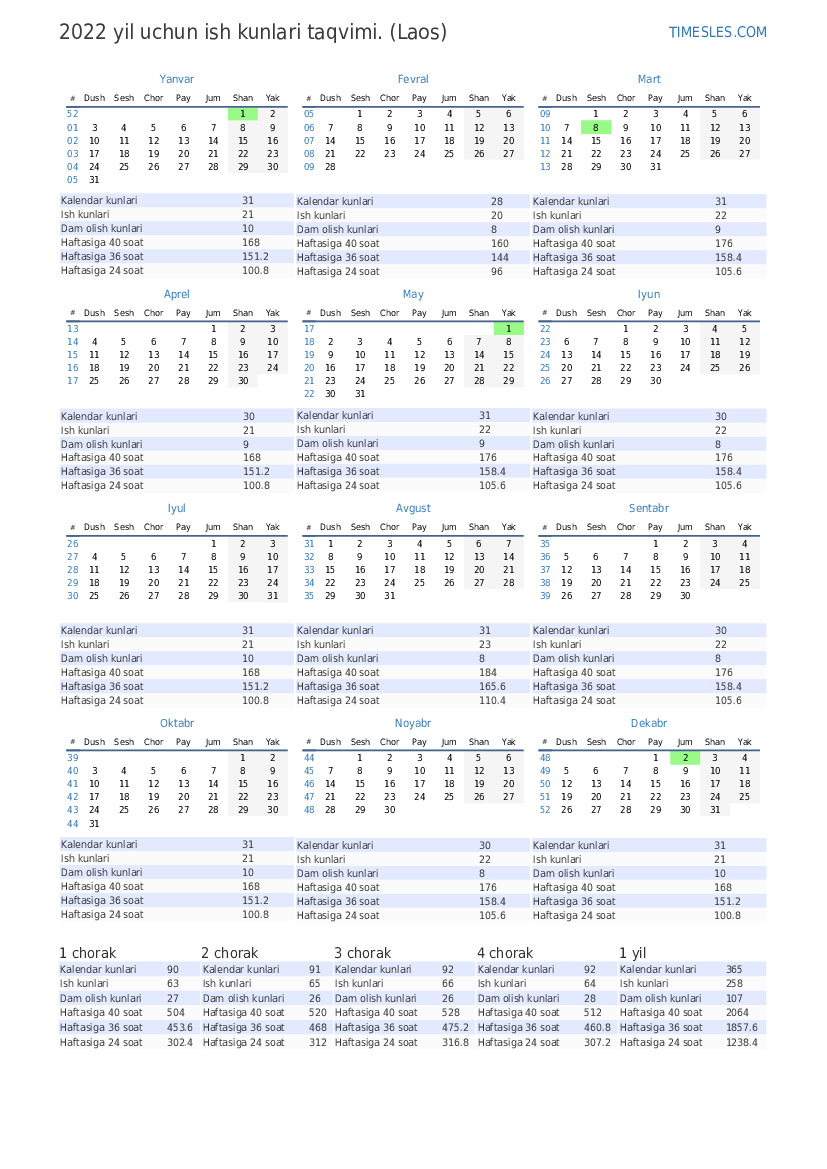 Laos uchun 2022 yil 3-choragi uchun ta'til va dam olish kunlari bilan ish kunlari taqvimi