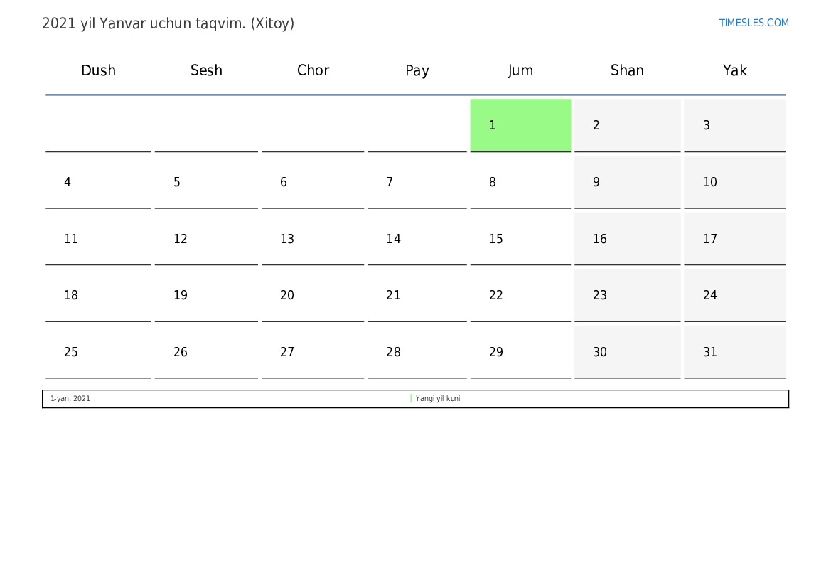 Xitoy uchun 2021 yil Yanvar uchun ta'til va dam olish kunlari taqvimi