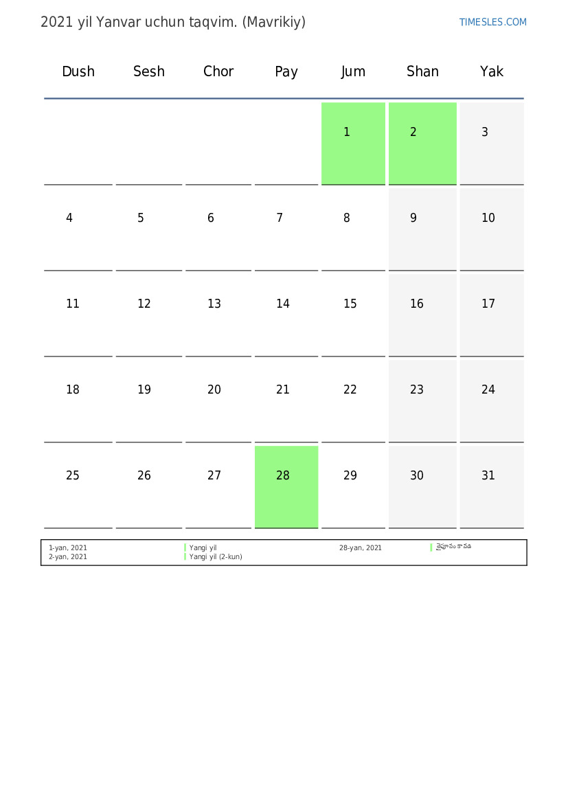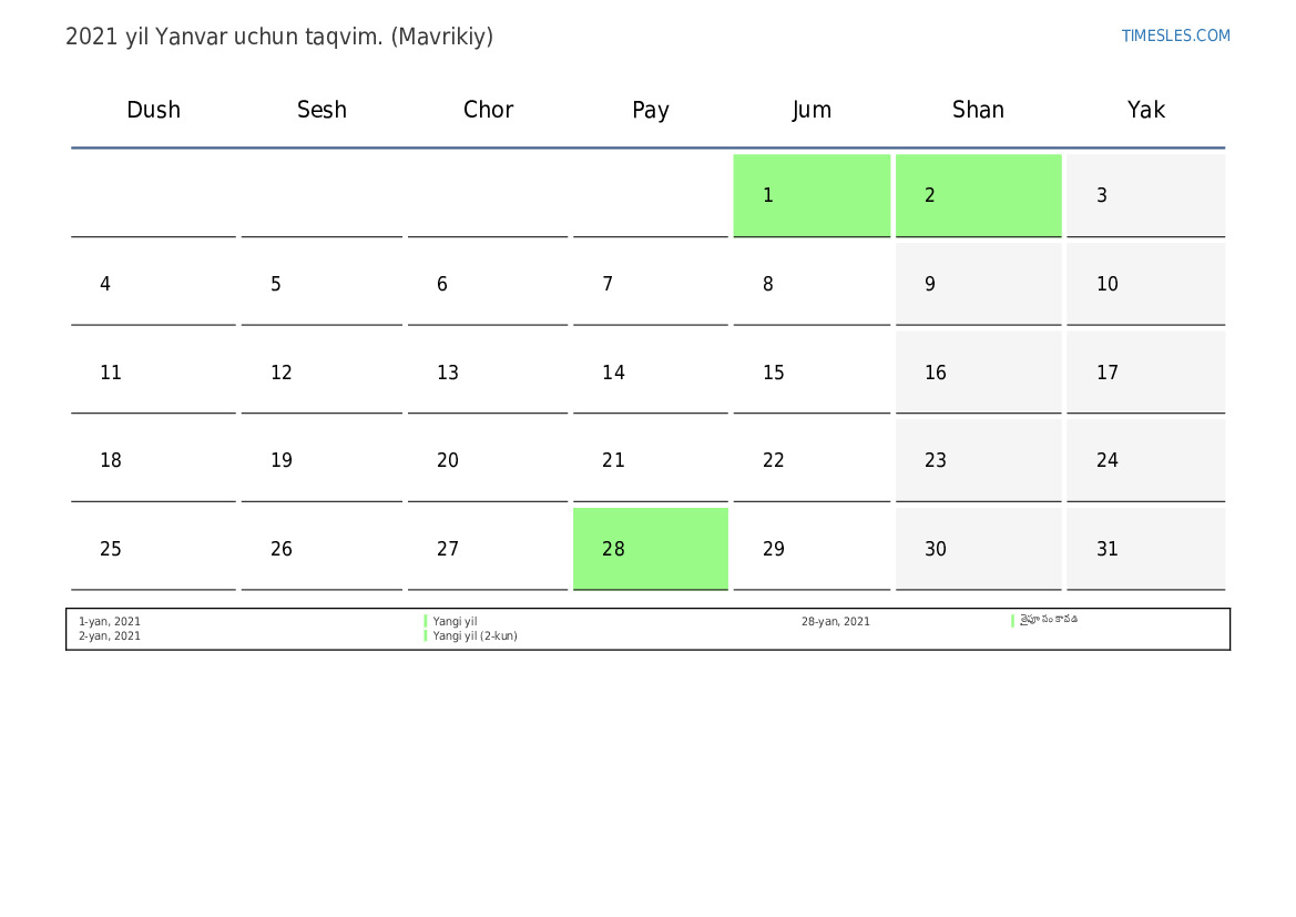 Mavrikiy uchun 2021 yil Yanvar kalendar