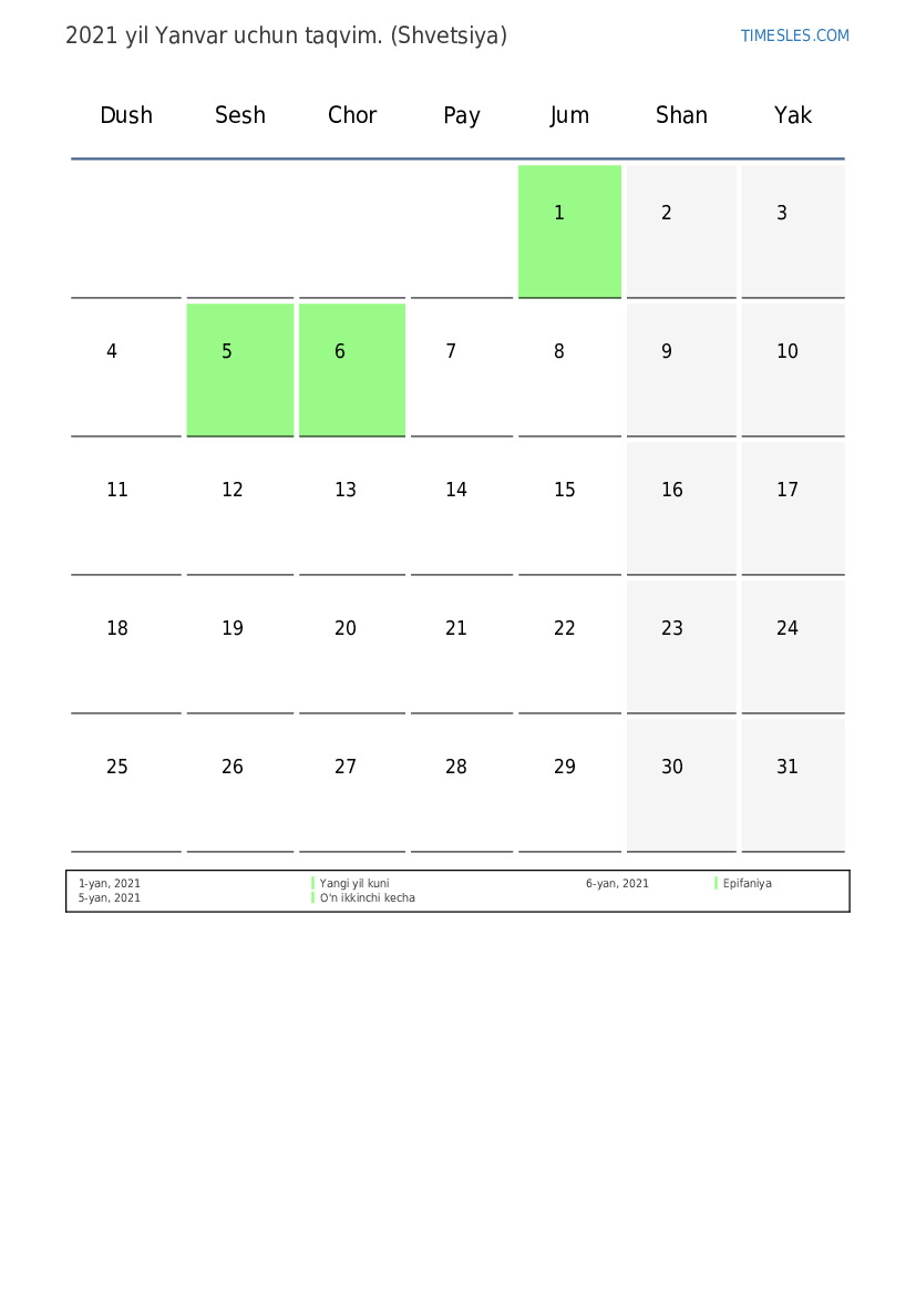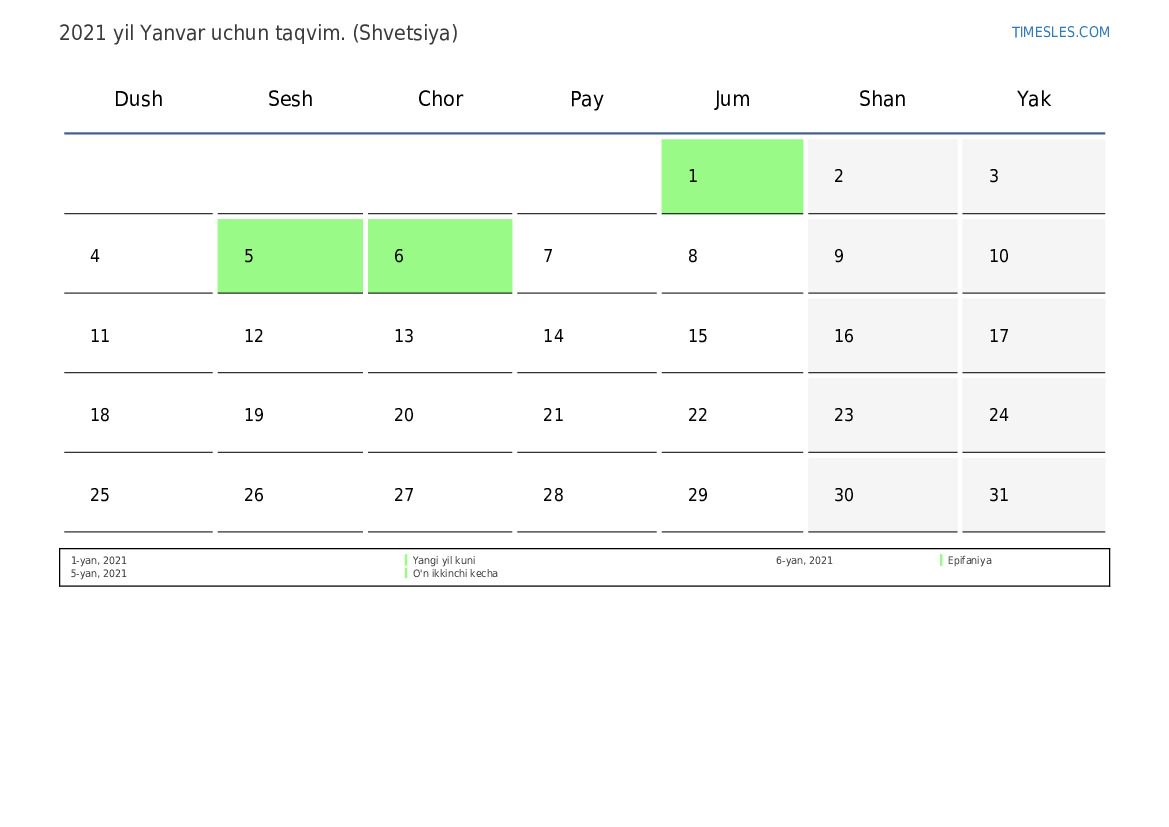 Shvetsiya uchun 2021 yil Yanvar uchun ta'til va dam olish kunlari taqvimi
