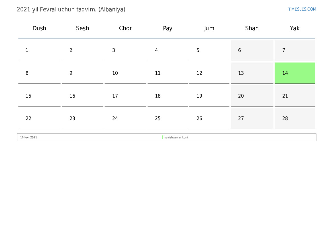 Albaniya uchun 2021 yil Fevral uchun ta'til va dam olish kunlari bilan PDF taqvimini yuklab oling va chop eting