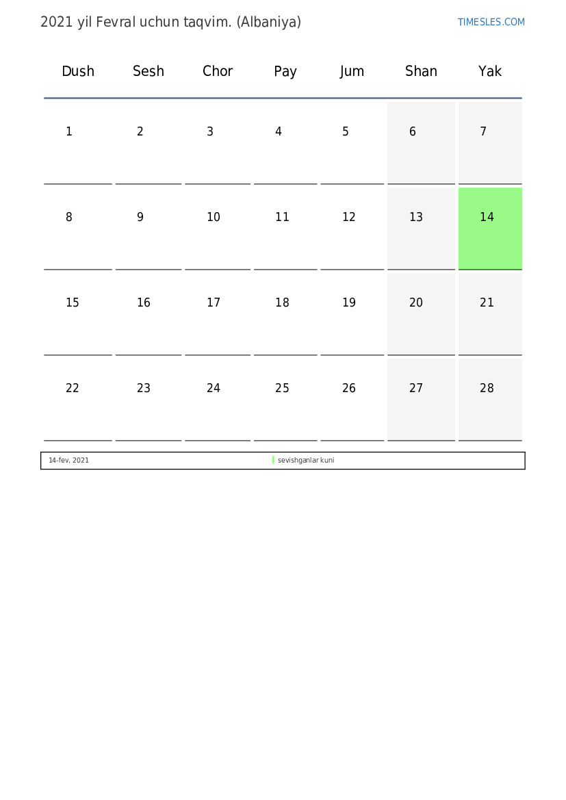 Albaniya uchun 2021 yil Fevral uchun ta'til va dam olish kunlari taqvimi