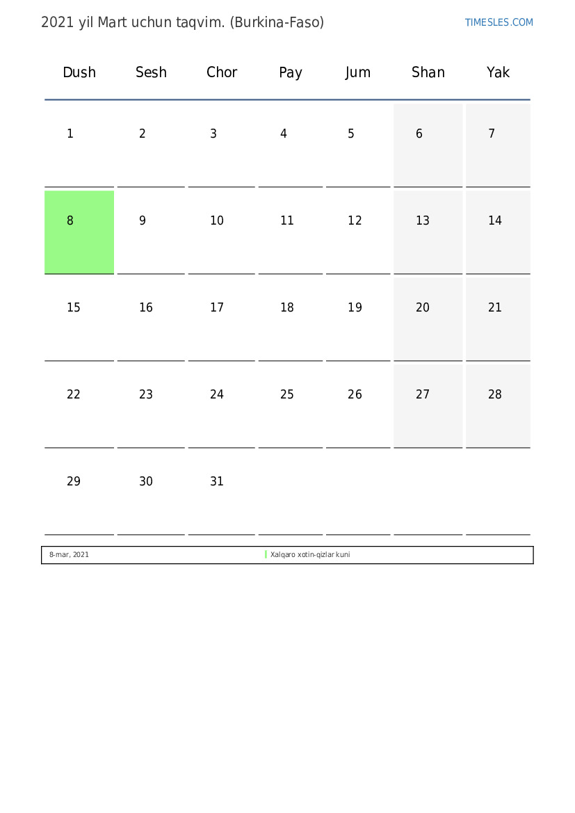 Burkina-Faso uchun 2021 yil Mart uchun ta'til va dam olish kunlari bilan PDF taqvimini yuklab oling va chop eting