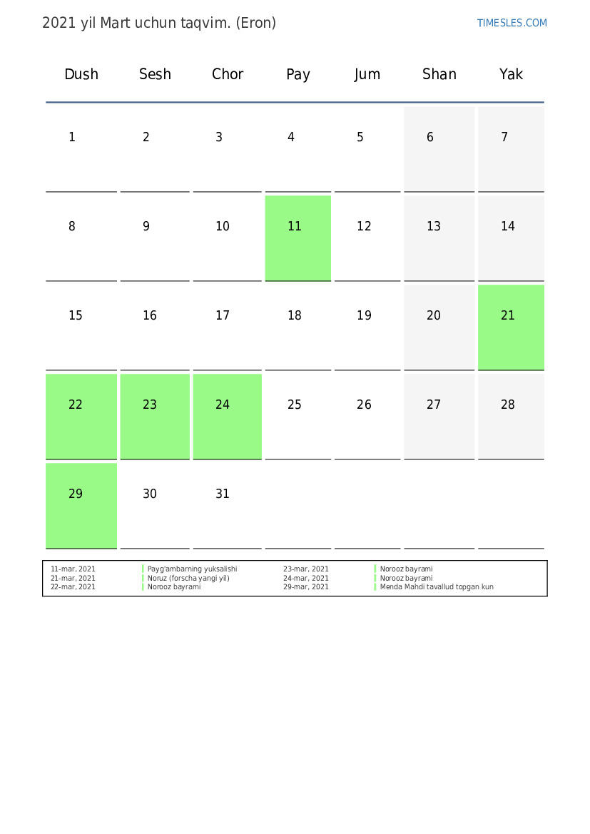 Eron uchun 2021 yil Mart uchun ta'til va dam olish kunlari taqvimi