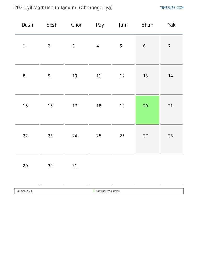 Chernogoriya uchun 2021 yil Mart uchun ta'til va dam olish kunlari bilan PDF taqvimini yuklab oling va chop eting