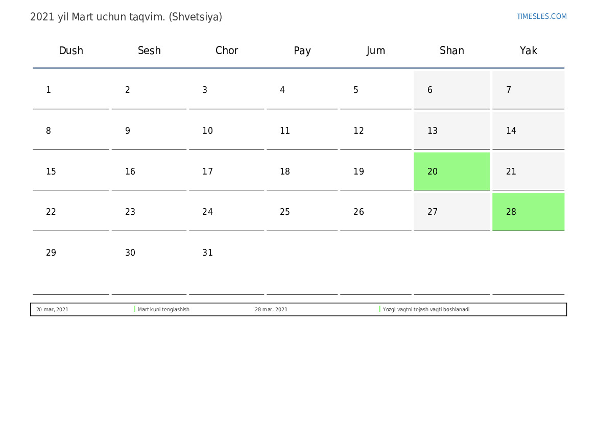 Shvetsiya uchun 2021 yil Mart uchun ta'til va dam olish kunlari taqvimi