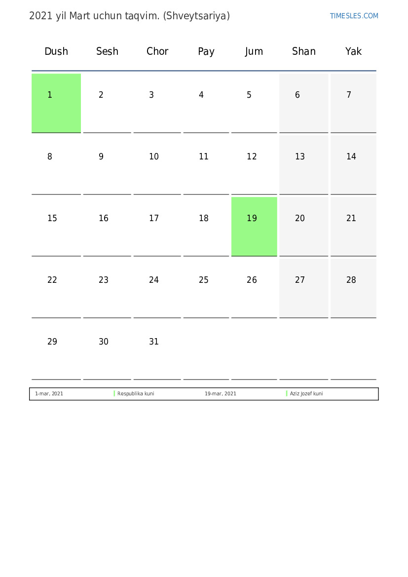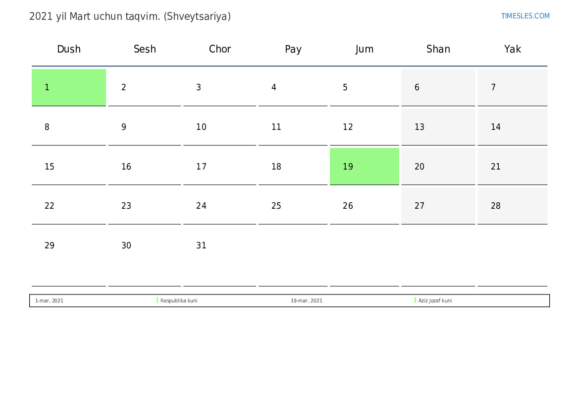 Shveytsariya uchun 2021 yil Mart uchun ta'til va dam olish kunlari taqvimi