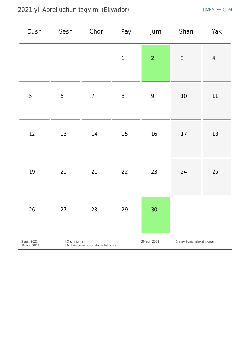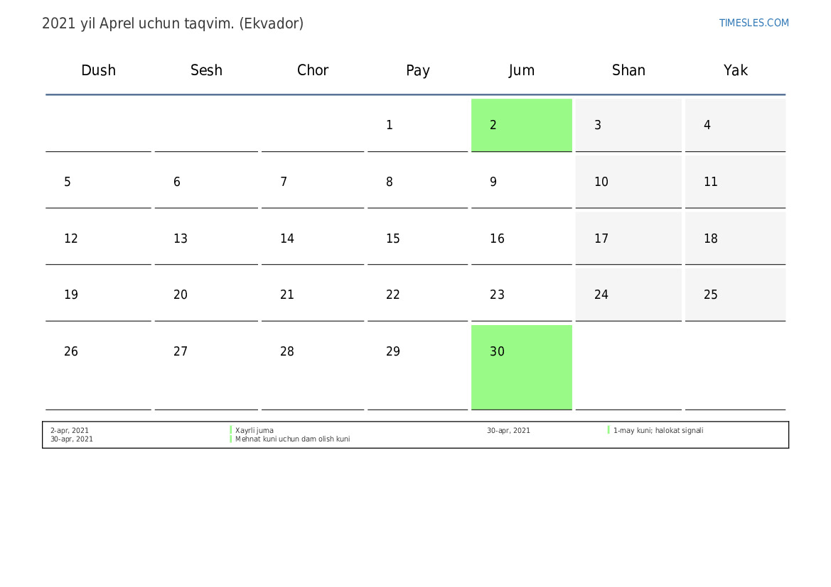 Ekvador uchun 2021 yil Aprel uchun ta'til va dam olish kunlari taqvimi