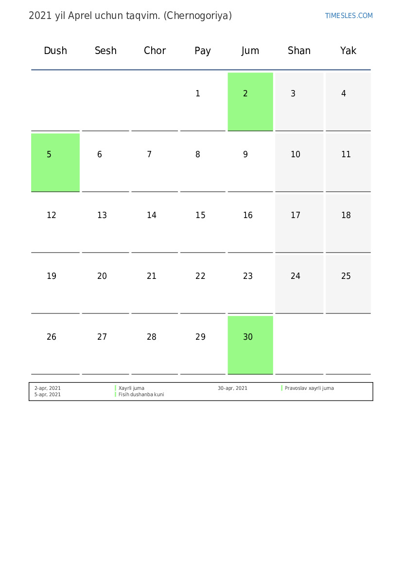 Chernogoriya uchun 2021 yil Aprel kalendar