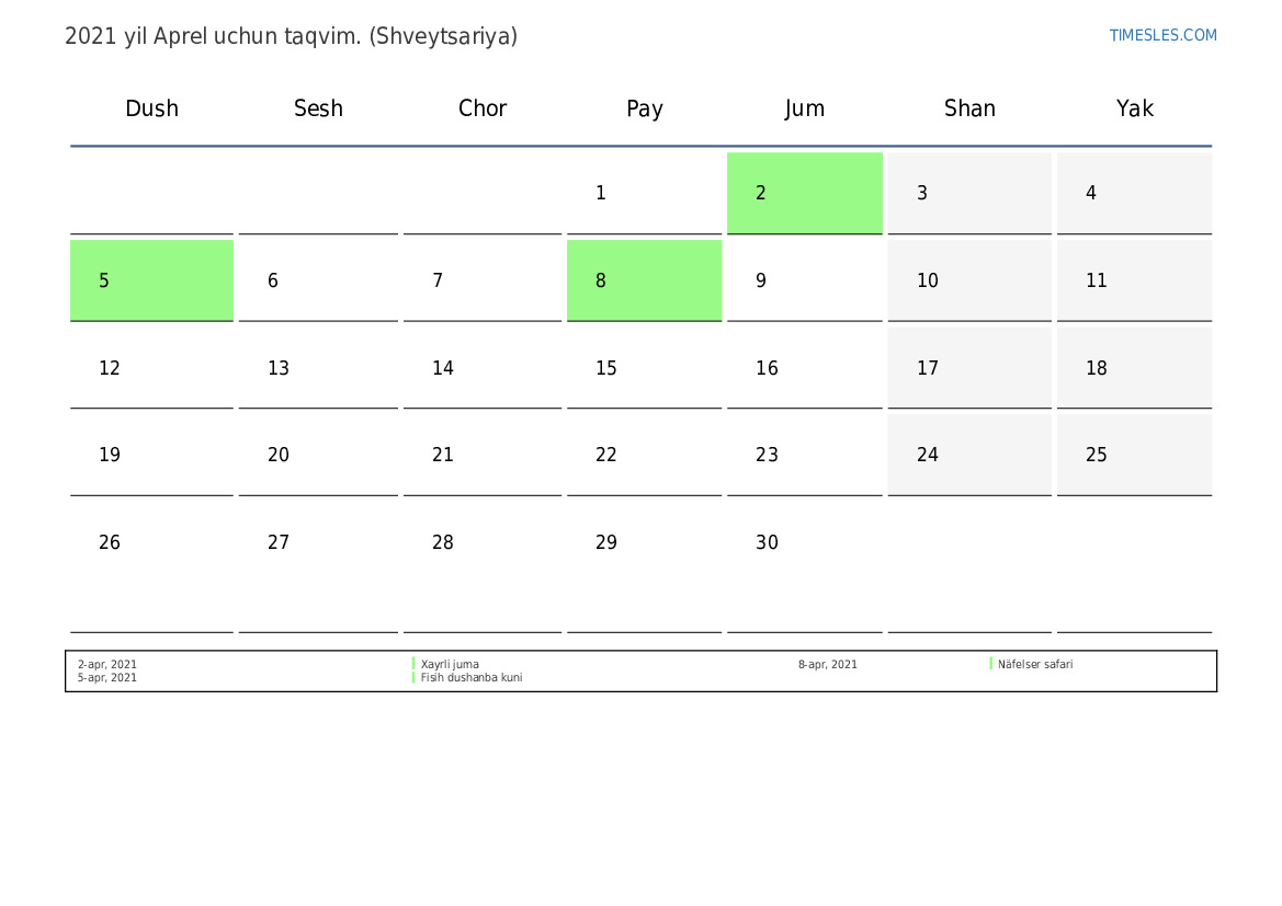 Shveytsariya uchun 2021 yil Aprel uchun ta'til va dam olish kunlari taqvimi