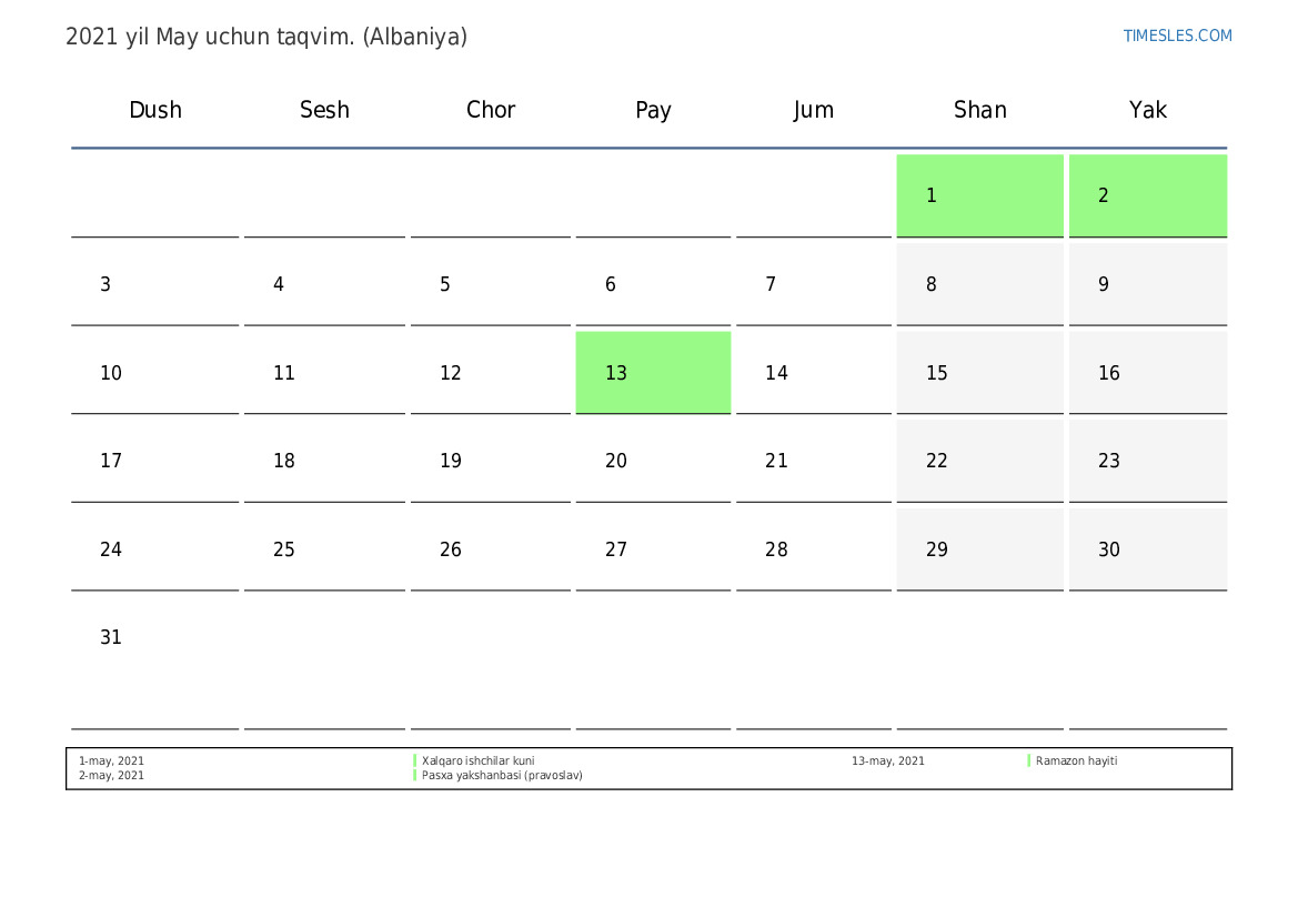 Albaniya uchun 2021 yil May uchun ta'til va dam olish kunlari taqvimi