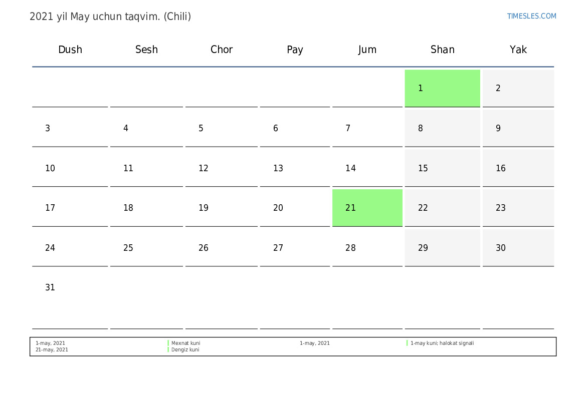 Chili uchun 2021 yil May uchun ta'til va dam olish kunlari taqvimi