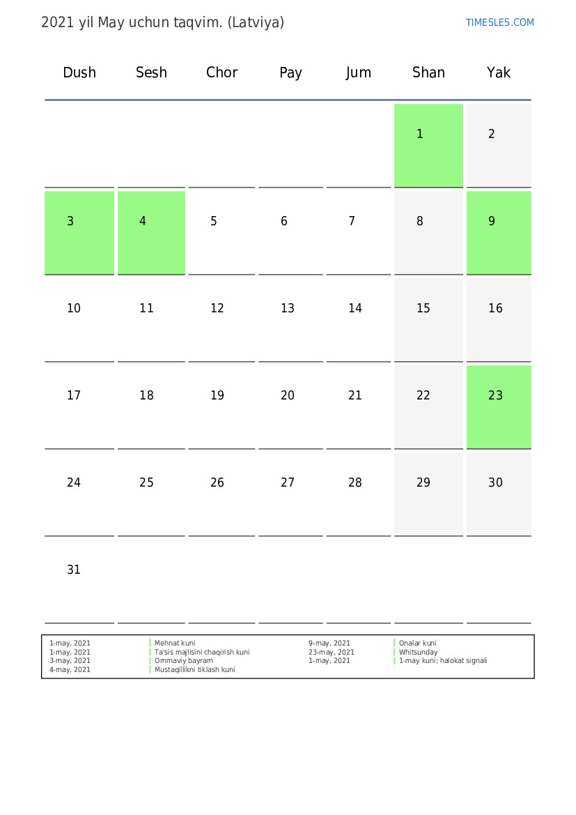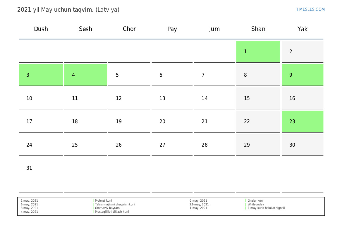 Latviya uchun 2021 yil May uchun ta'til va dam olish kunlari taqvimi