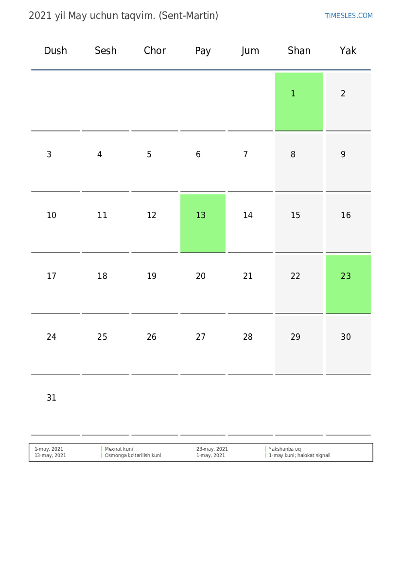 Sint Marten uchun 2021 yil May uchun ta'til va dam olish kunlari taqvimi