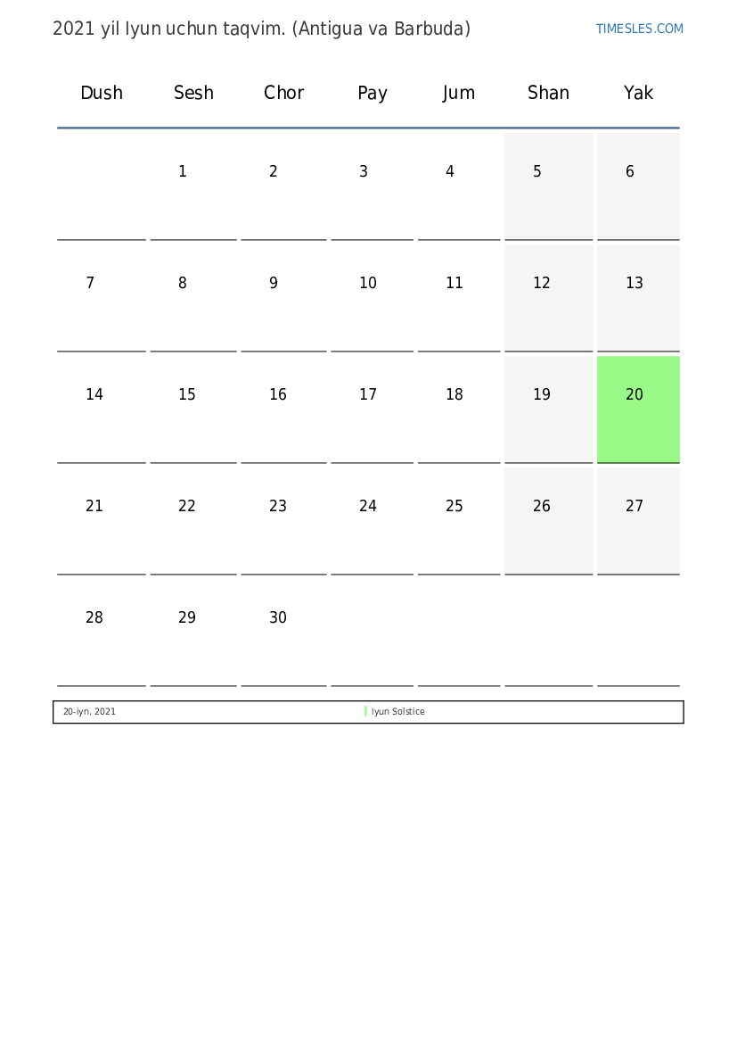 Antigua va Barbuda uchun 2021 yil Iyun kalendar