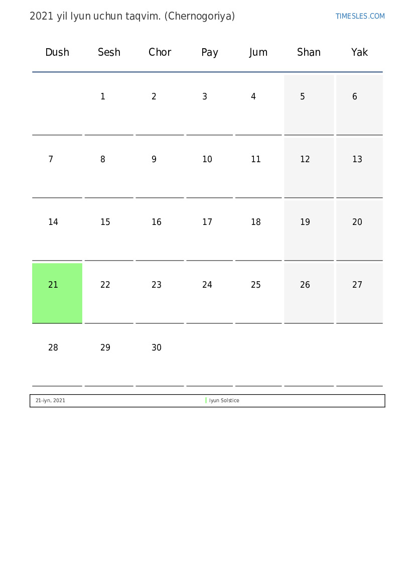 Iyun oyi 30 kun o'z ichiga oladi. Bu 2021 yilning 6 oyi. Yil fasli: yoz. Iyun oyi seshanba kuni boshlanadi va chorshanba kuni tugaydi. 2021 yil Iyun oyida Chernogoriyada 1 ta'til va dam olish kuni mavjud.