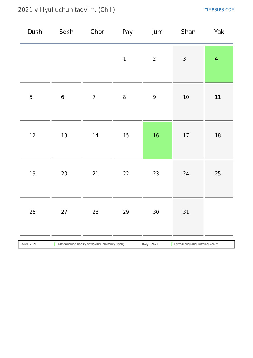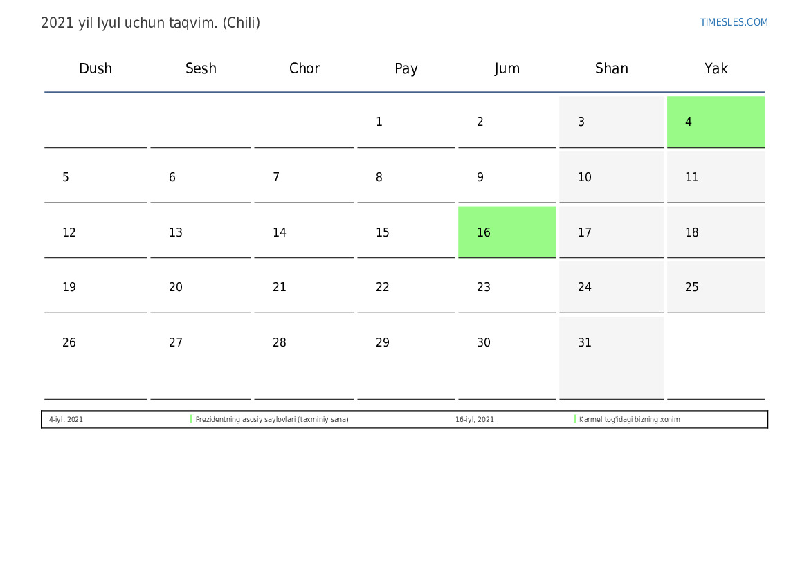Chili uchun 2021 yil Iyul uchun ta'til va dam olish kunlari taqvimi