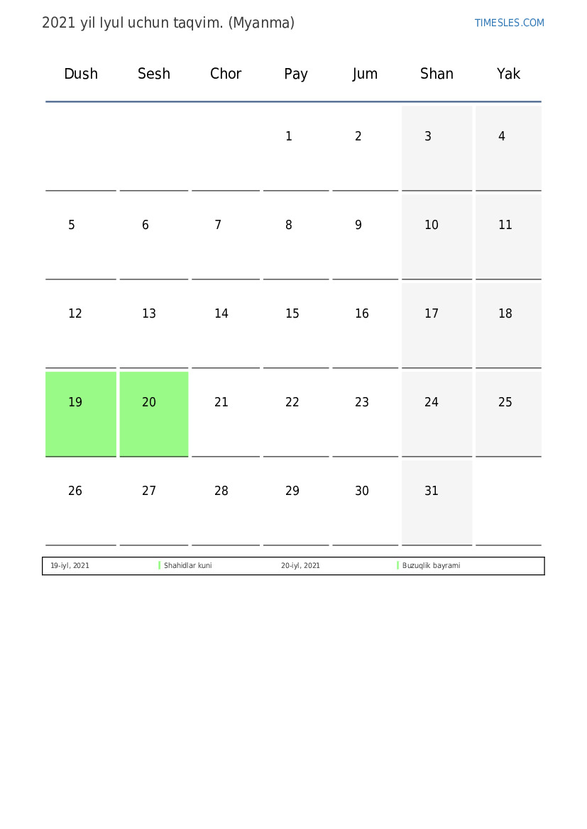 Myanma uchun 2021 yil Iyul uchun ta'til va dam olish kunlari taqvimi