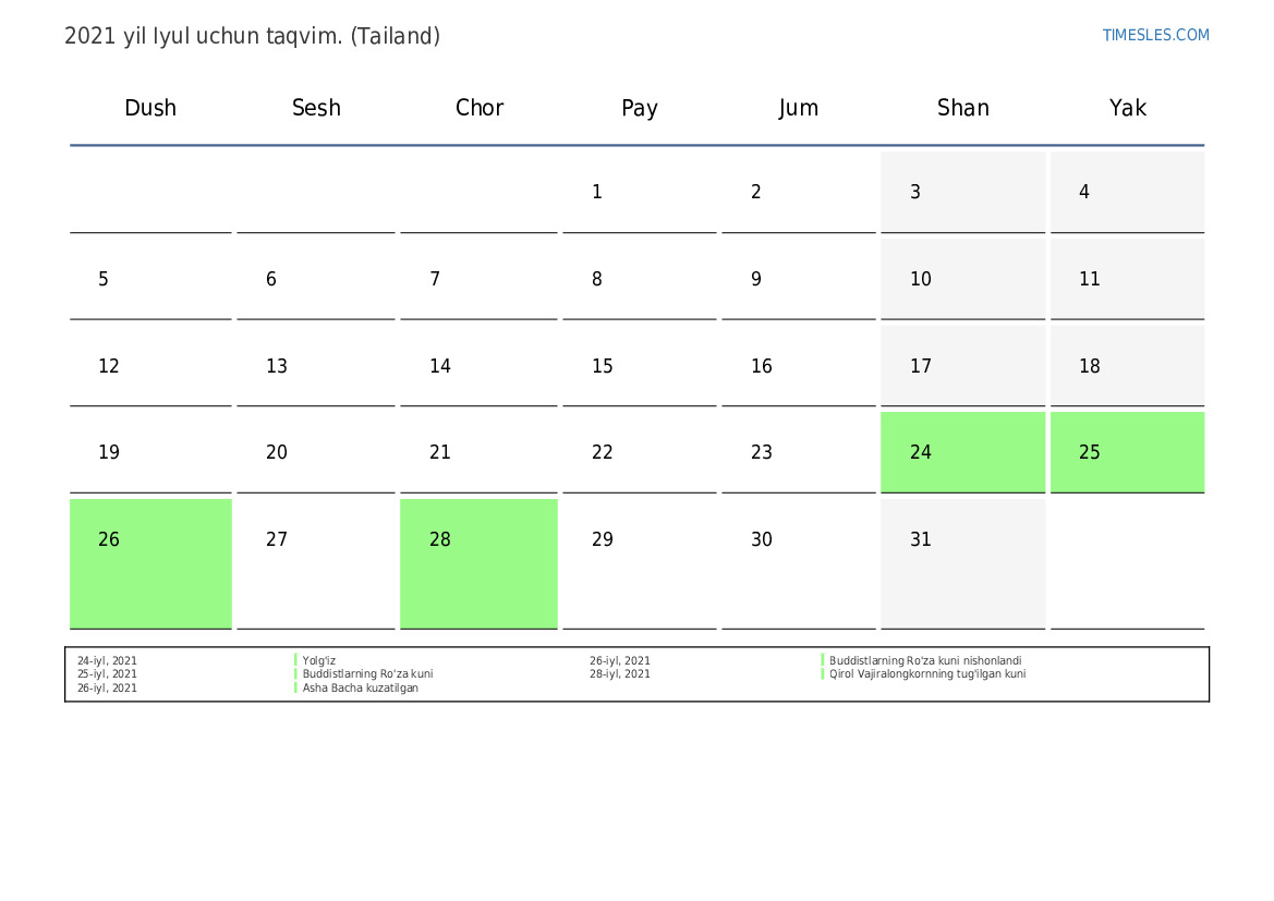 Tailand uchun 2021 yil Iyul uchun ta'til va dam olish kunlari taqvimi