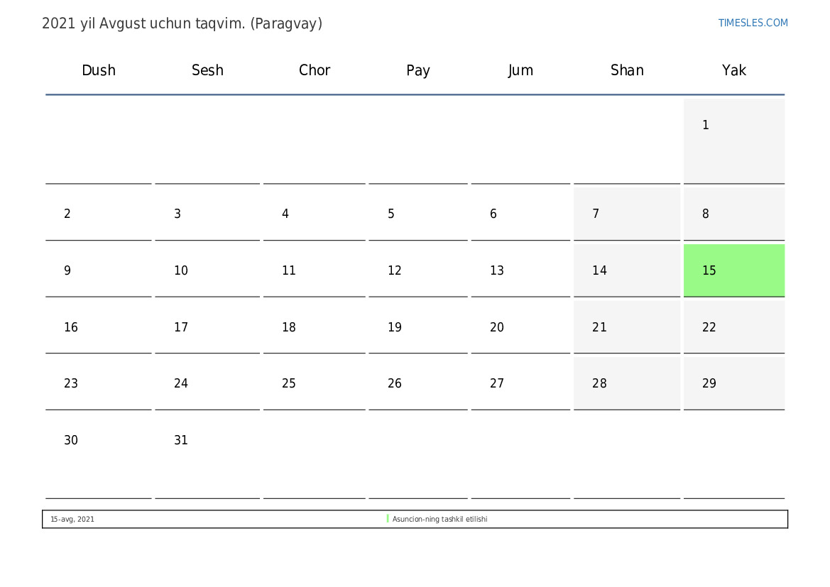 Paragvay uchun 2021 yil Avgust uchun ta'til va dam olish kunlari taqvimi