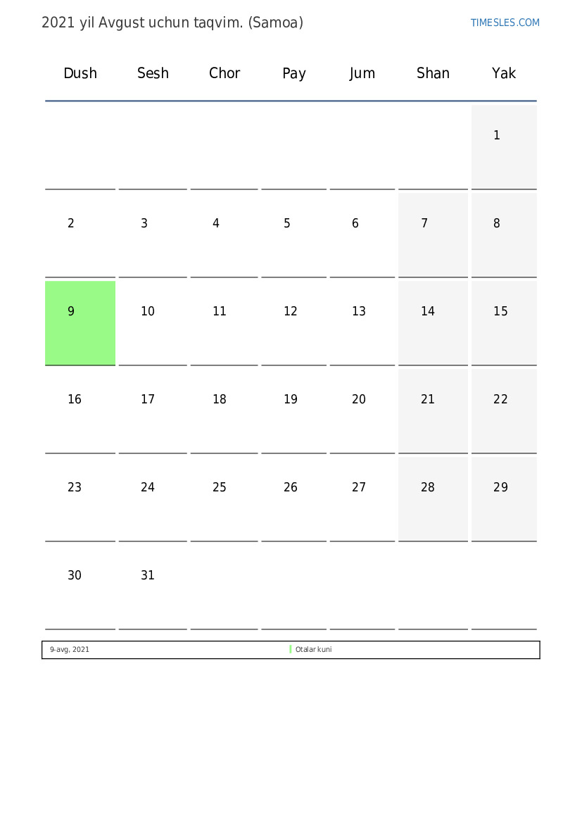 Samoa uchun 2021 yil Avgust uchun ta'til va dam olish kunlari taqvimi