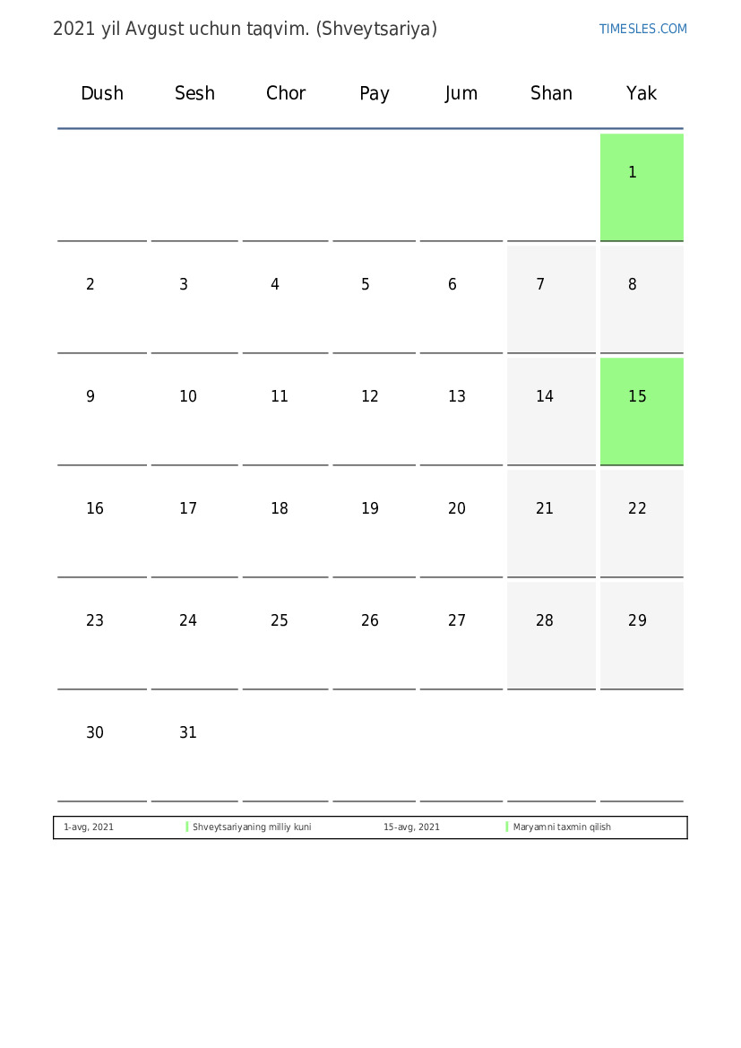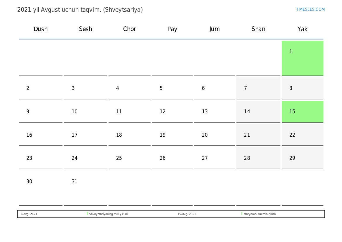 Shveytsariya uchun 2021 yil Avgust kalendar