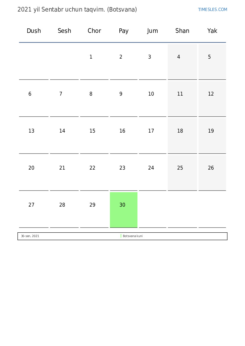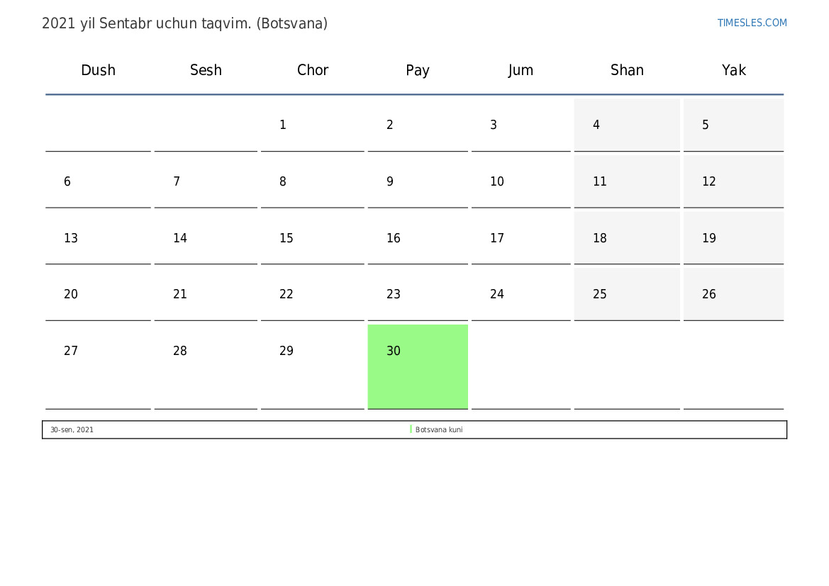 Botsvana uchun 2021 yil Sentabr uchun ta'til va dam olish kunlari taqvimi