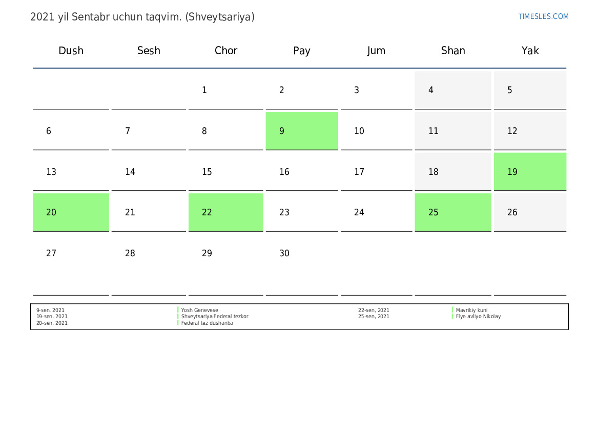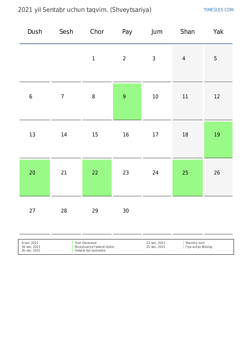 Shveytsariya uchun 2021 yil Sentabr uchun ta'til va dam olish kunlari taqvimi