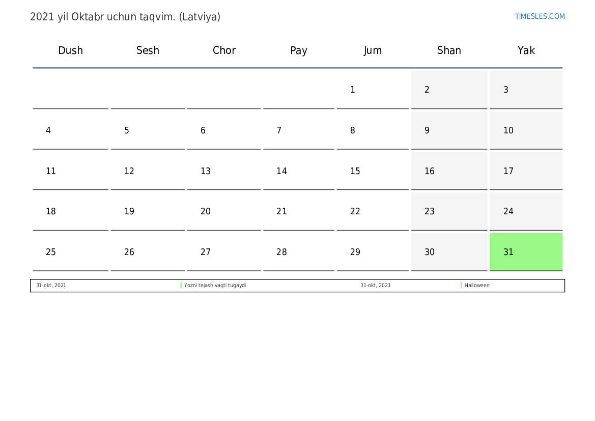 Latviya uchun 2021 yil Oktabr kalendar
