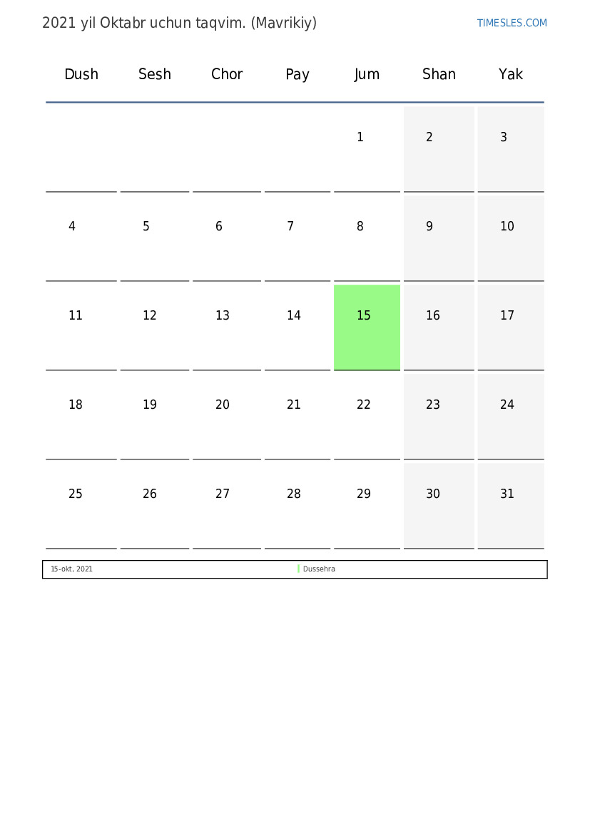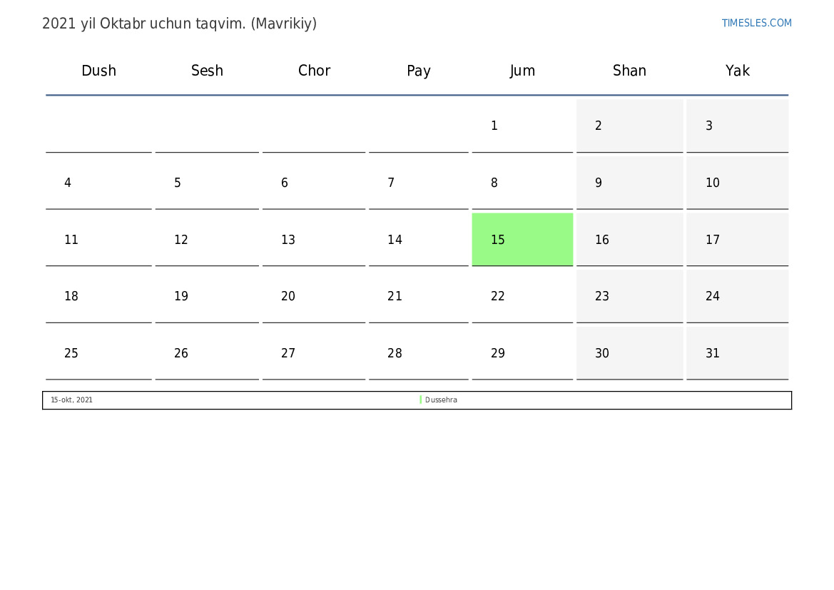 Mavrikiy uchun 2021 yil Oktabr kalendar
