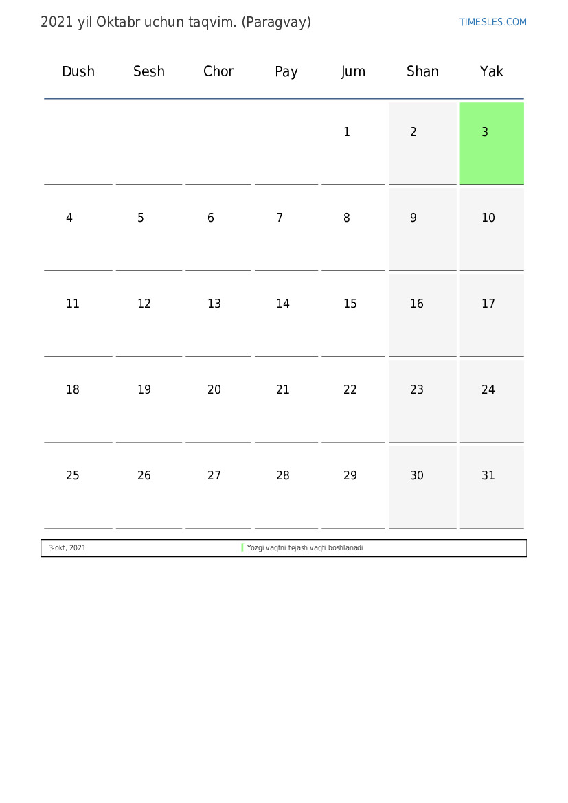 Paragvay uchun 2021 yil Oktabr kalendar