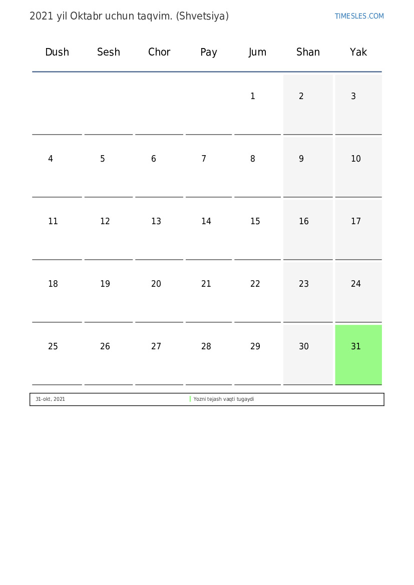 Shvetsiya uchun 2021 yil Oktabr kalendar