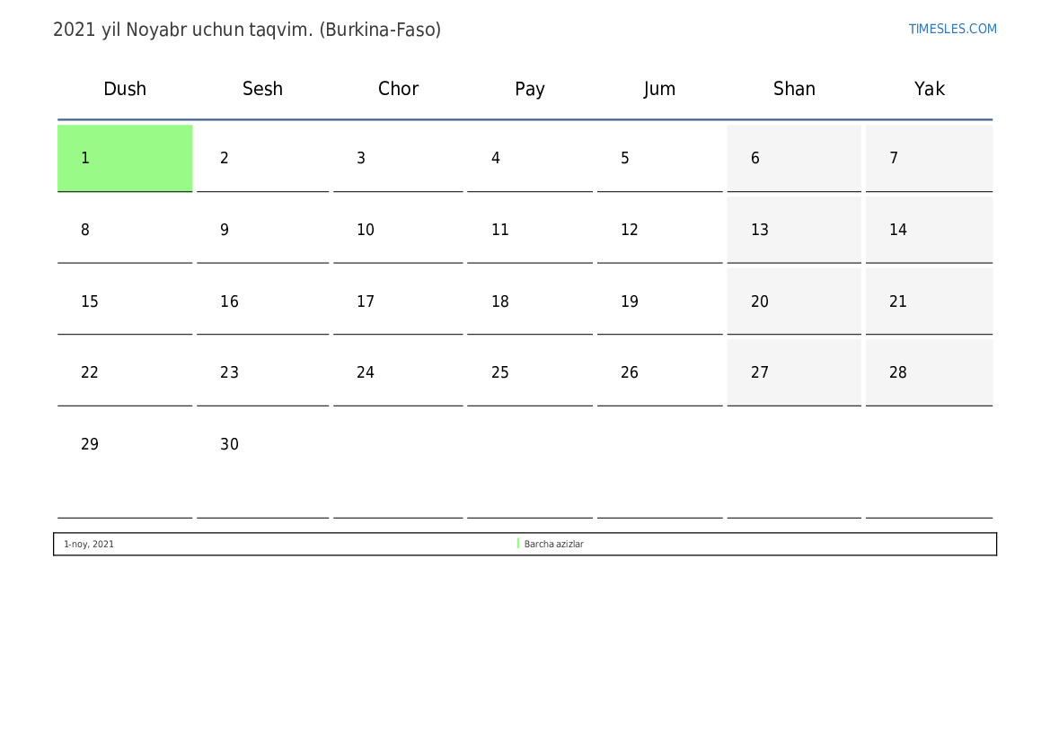 Burkina-Faso uchun 2021 yil Noyabr uchun ta'til va dam olish kunlari bilan PDF taqvimini yuklab oling va chop eting