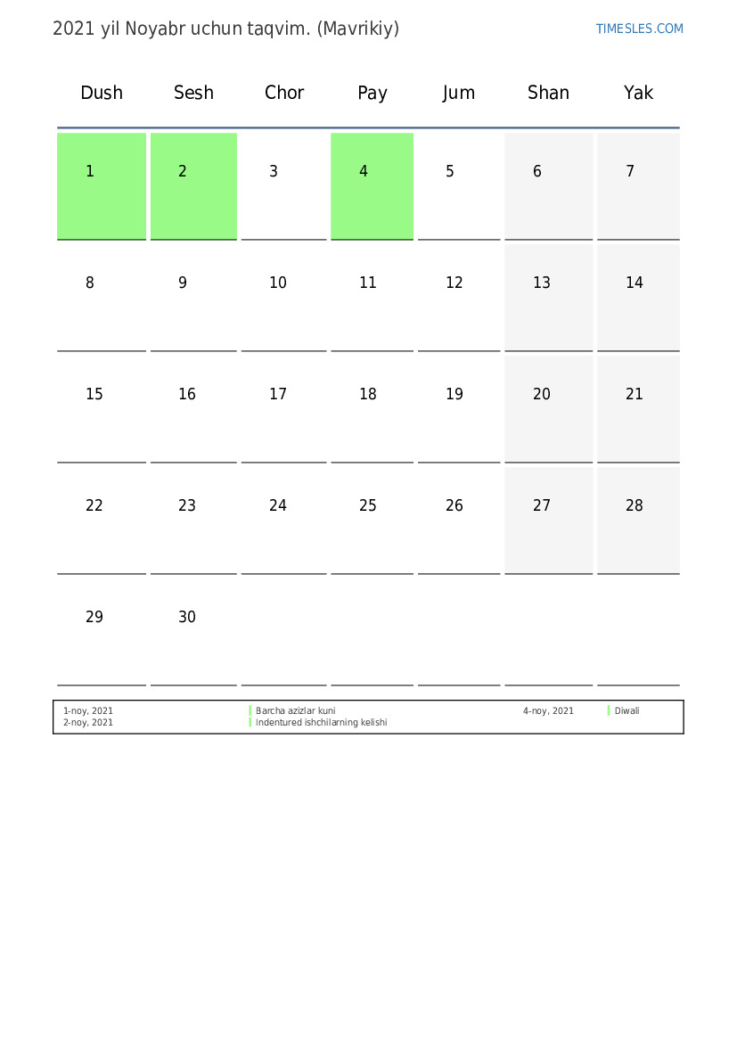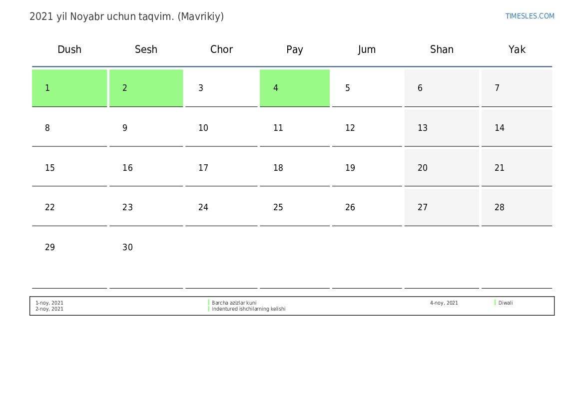 Mavrikiy uchun 2021 yil Noyabr uchun ta'til va dam olish kunlari bilan PDF taqvimini yuklab oling va chop eting