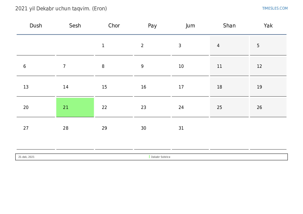 Eron uchun 2021 yil Dekabr uchun ta'til va dam olish kunlari bilan PDF taqvimini yuklab oling va chop eting