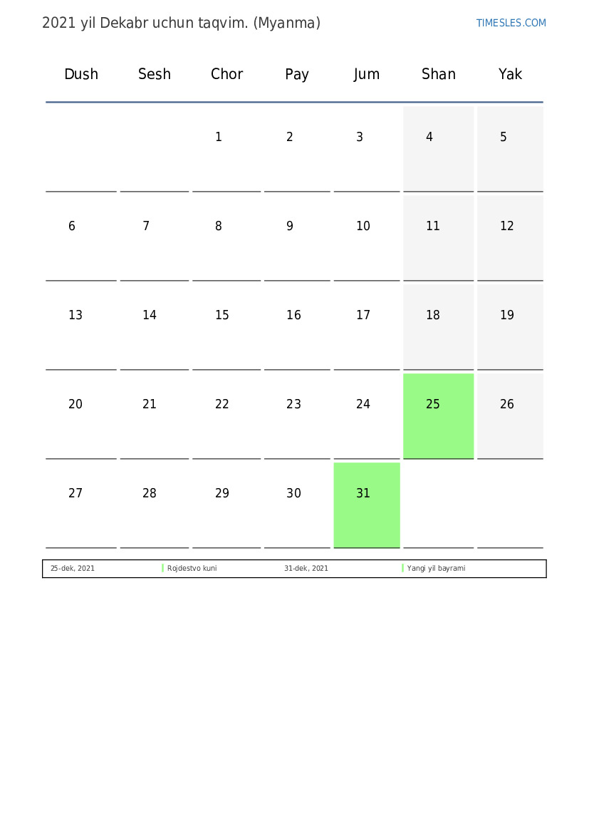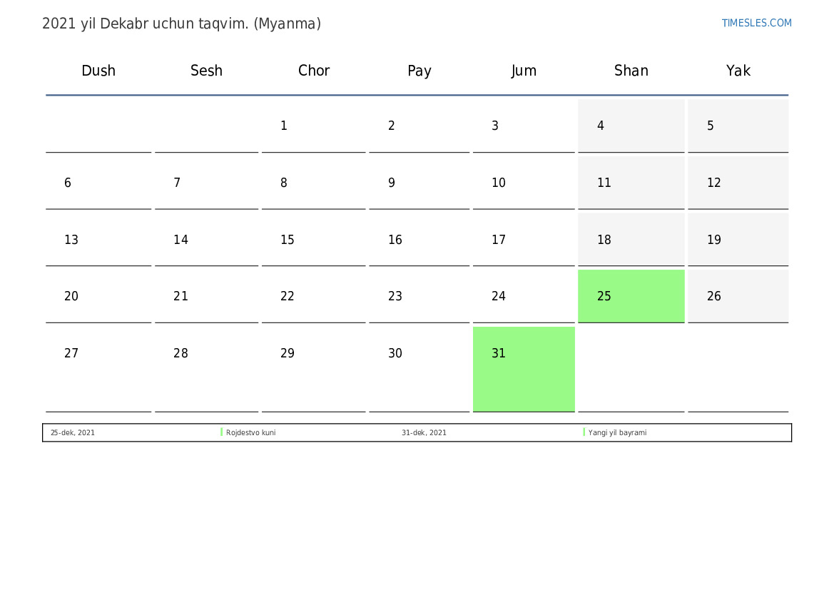Myanma uchun 2021 yil Dekabr uchun ta'til va dam olish kunlari bilan PDF taqvimini yuklab oling va chop eting