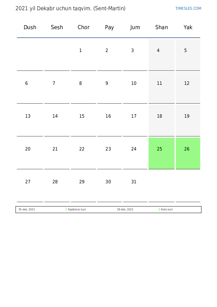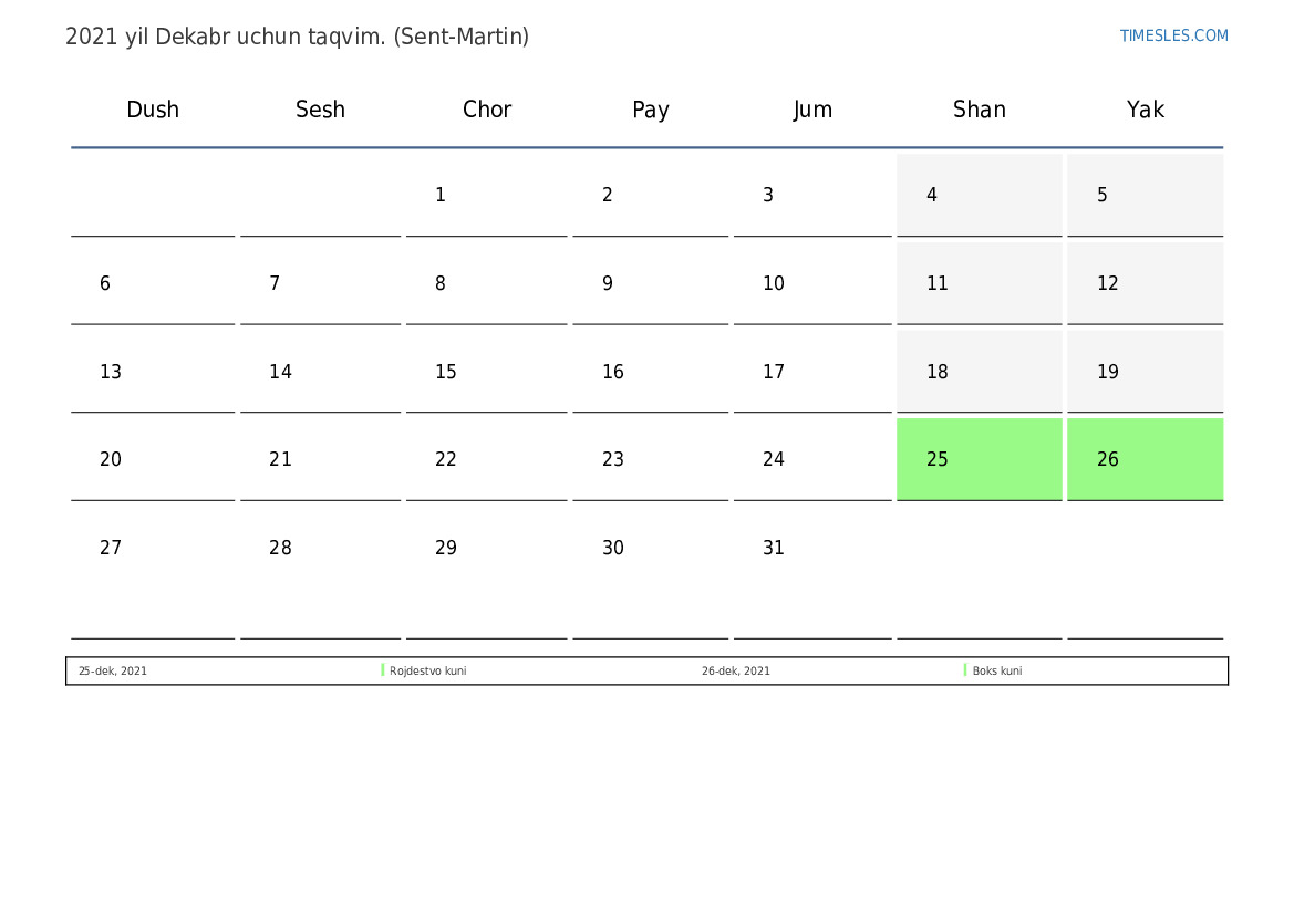 Sint Marten uchun 2021 yil Dekabr uchun ta'til va dam olish kunlari bilan PDF taqvimini yuklab oling va chop eting