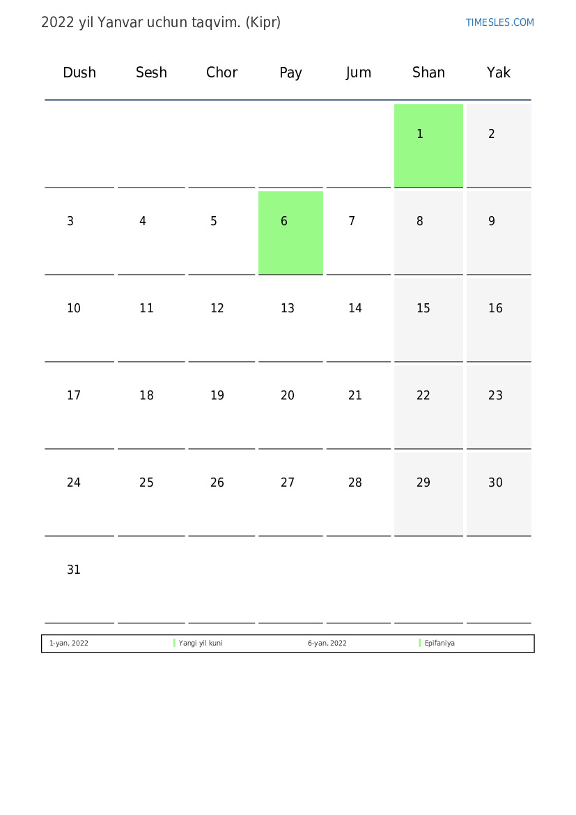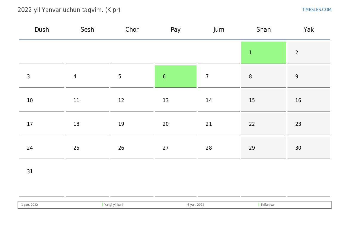 Kipr uchun 2022 yil Yanvar uchun ta'til va dam olish kunlari taqvimi