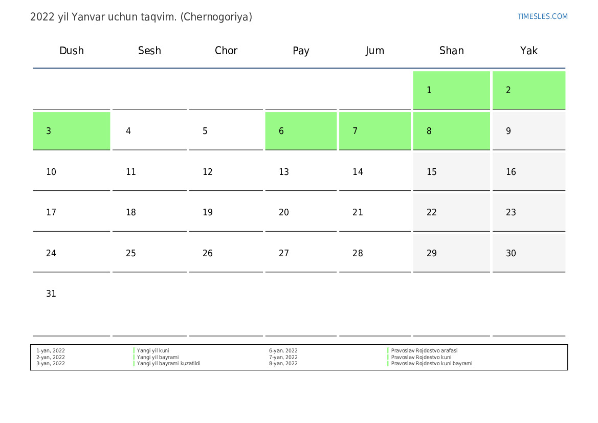 Chernogoriya uchun 2022 yil Yanvar uchun ta'til va dam olish kunlari taqvimi