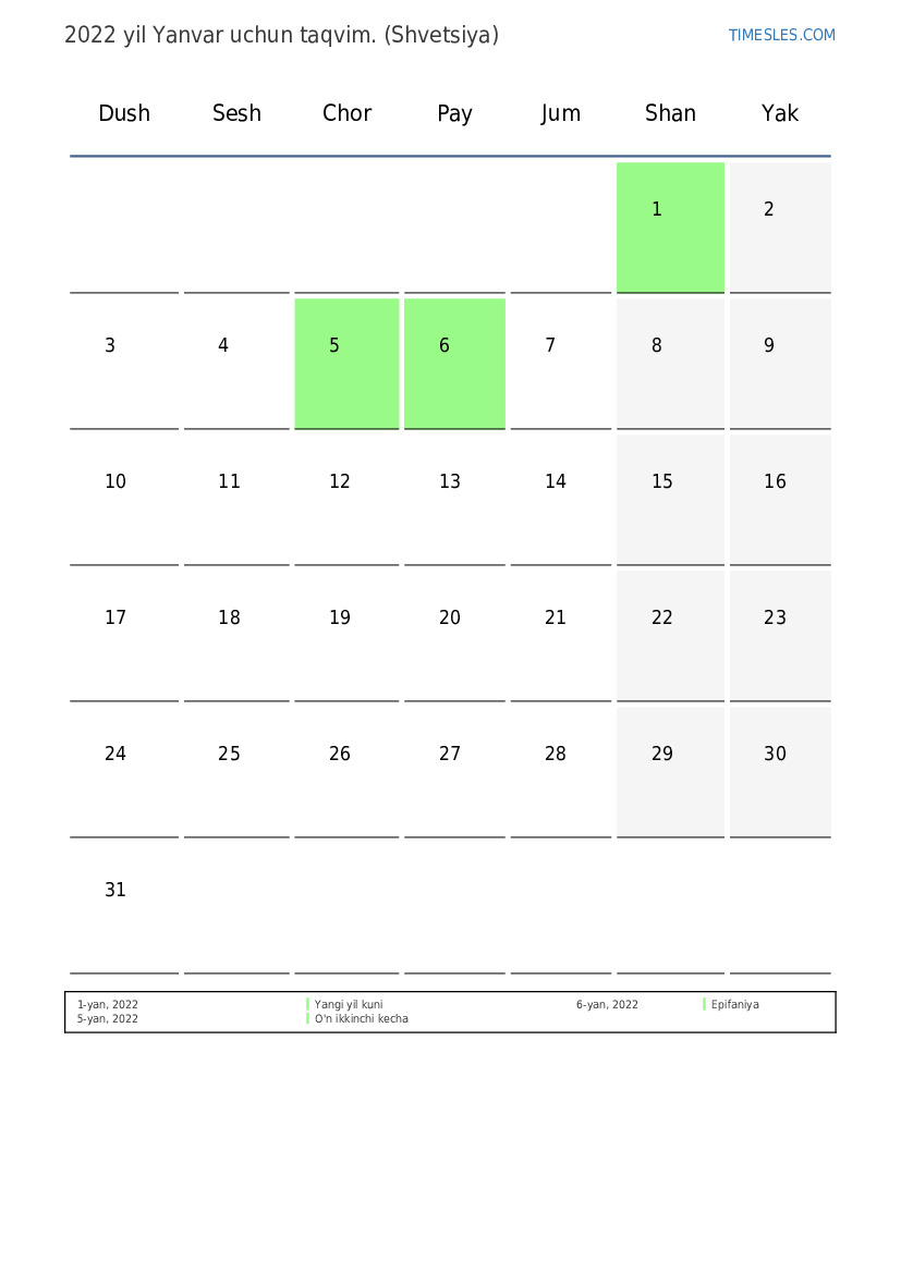 Shvetsiya uchun 2022 yil Yanvar uchun ta'til va dam olish kunlari taqvimi