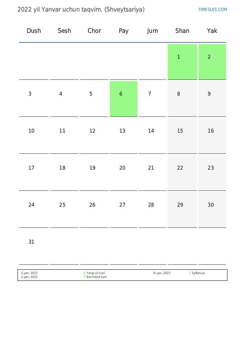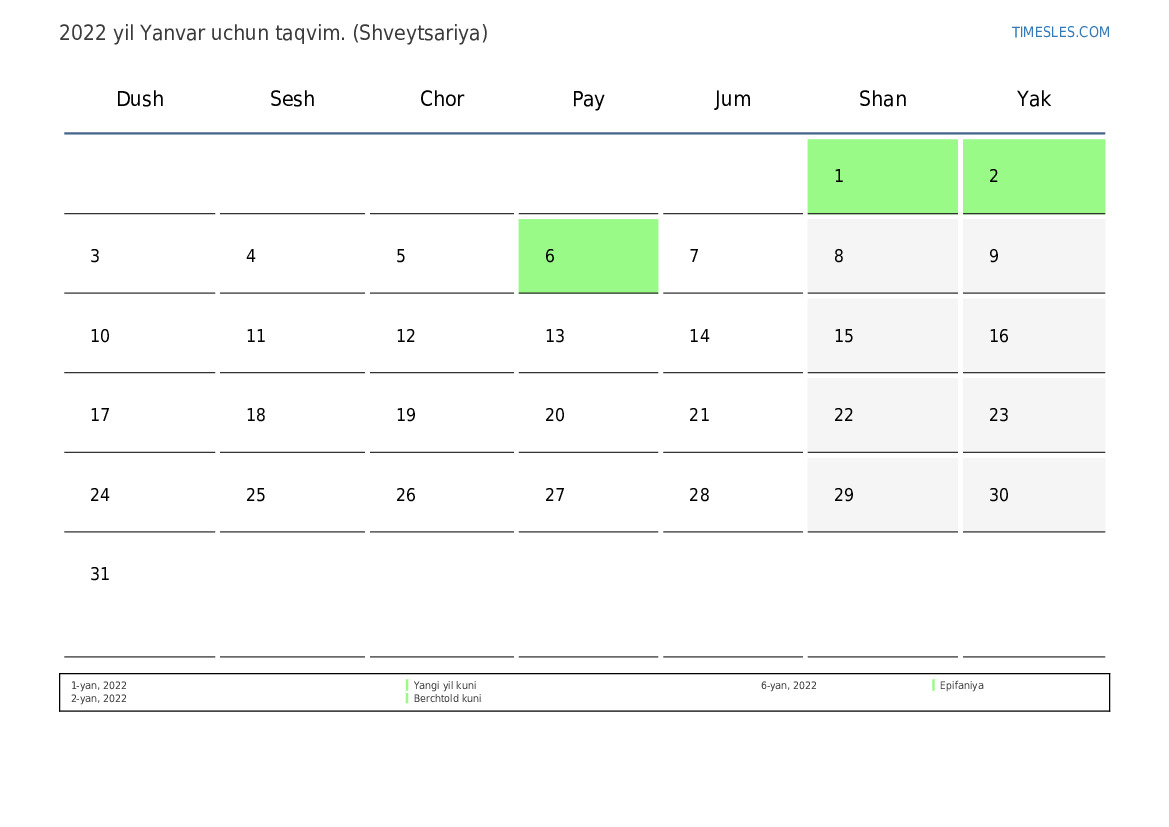 Shveytsariya uchun 2022 yil Yanvar uchun ta'til va dam olish kunlari taqvimi