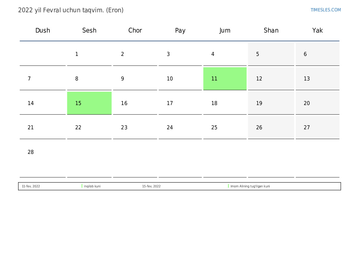 Eron uchun 2022 yil Fevral uchun ta'til va dam olish kunlari taqvimi