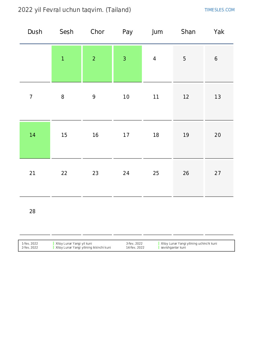 Tailand uchun 2022 yil Fevral uchun ta'til va dam olish kunlari taqvimi