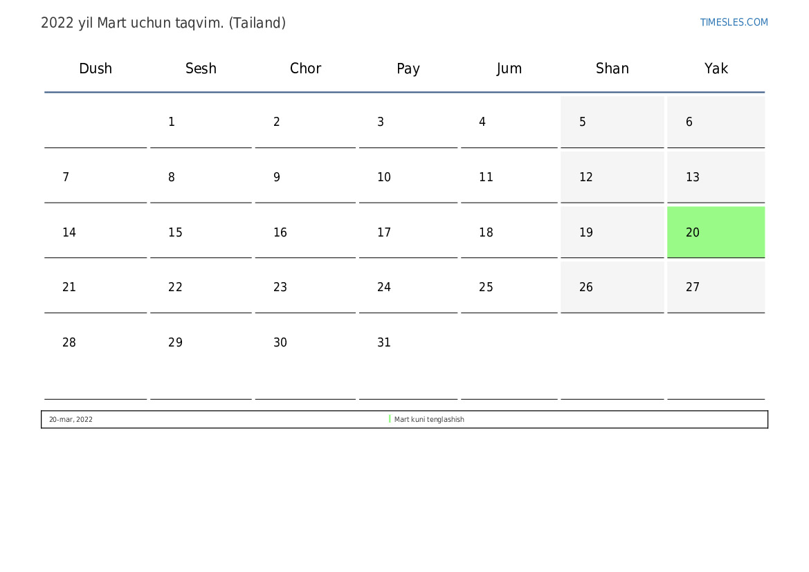 Tailand uchun 2022 yil Mart uchun ta'til va dam olish kunlari bilan PDF taqvimini yuklab oling va chop eting