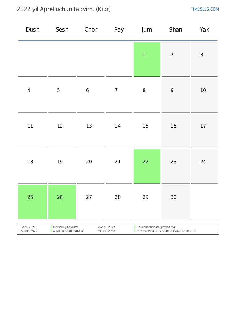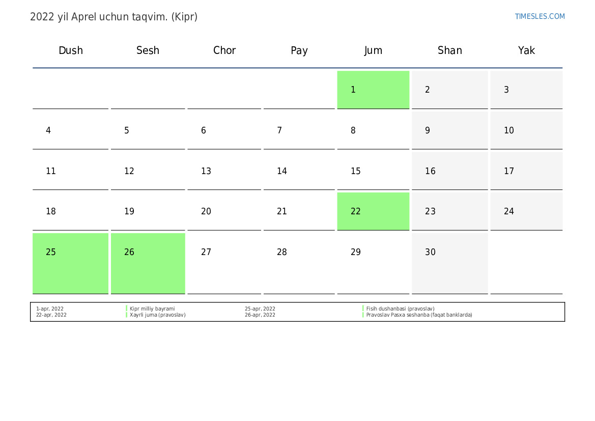 Kipr uchun 2022 yil Aprel uchun ta'til va dam olish kunlari taqvimi