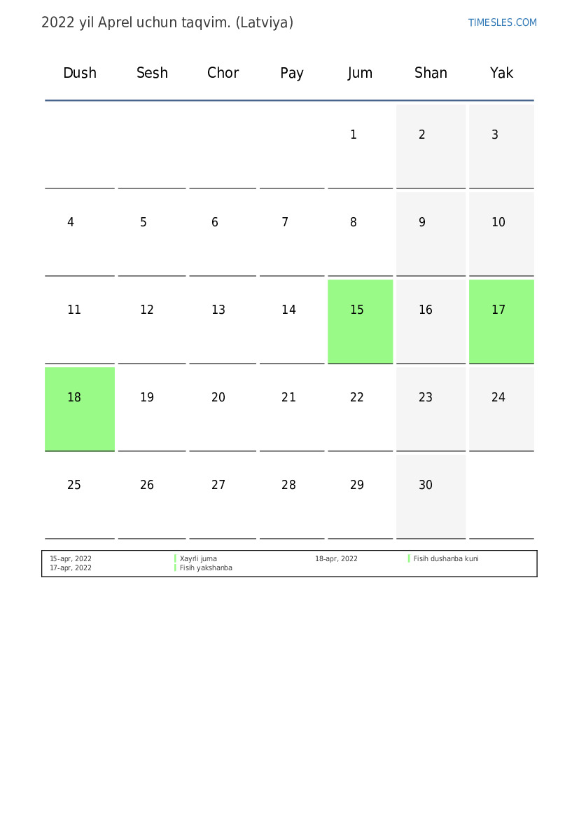 Latviya uchun 2022 yil Aprel uchun ta'til va dam olish kunlari taqvimi