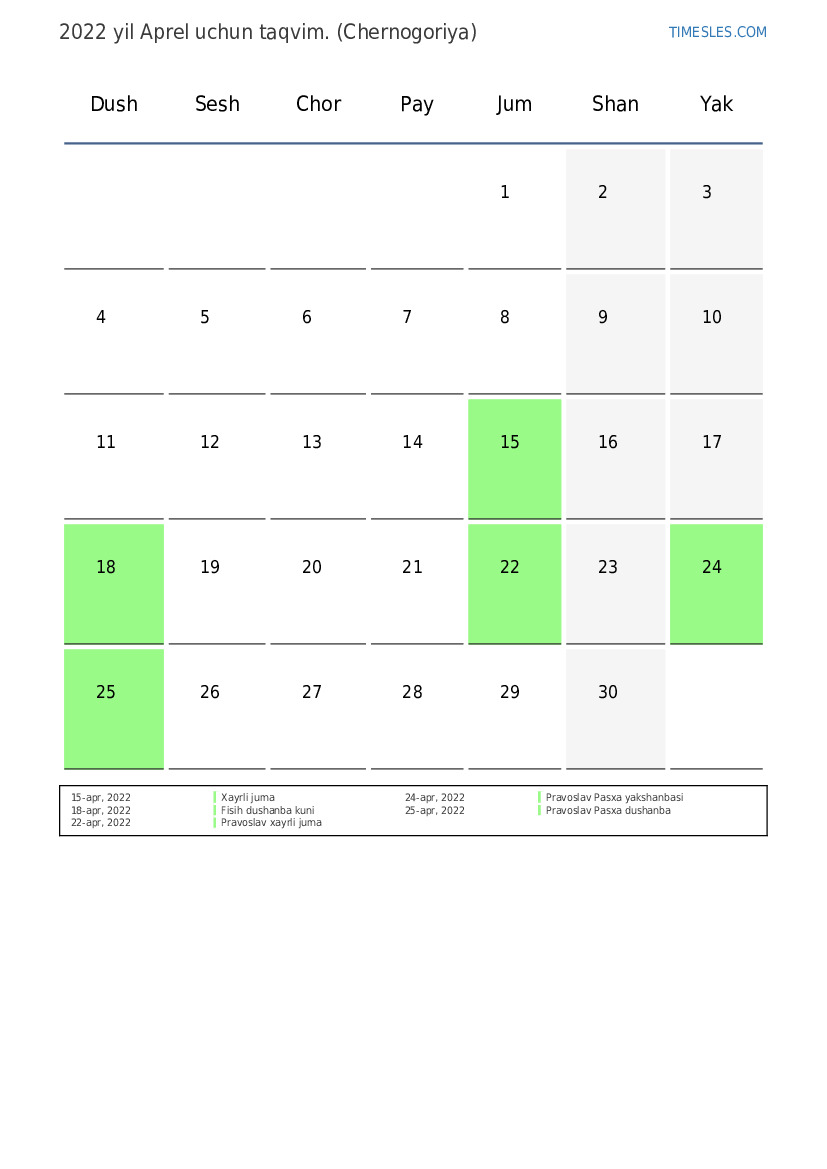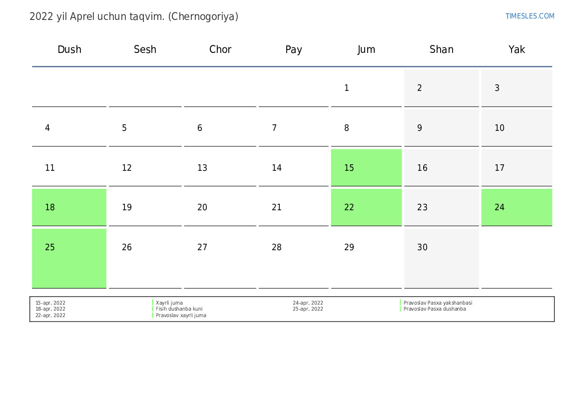 Chernogoriya uchun 2022 yil Aprel kalendar