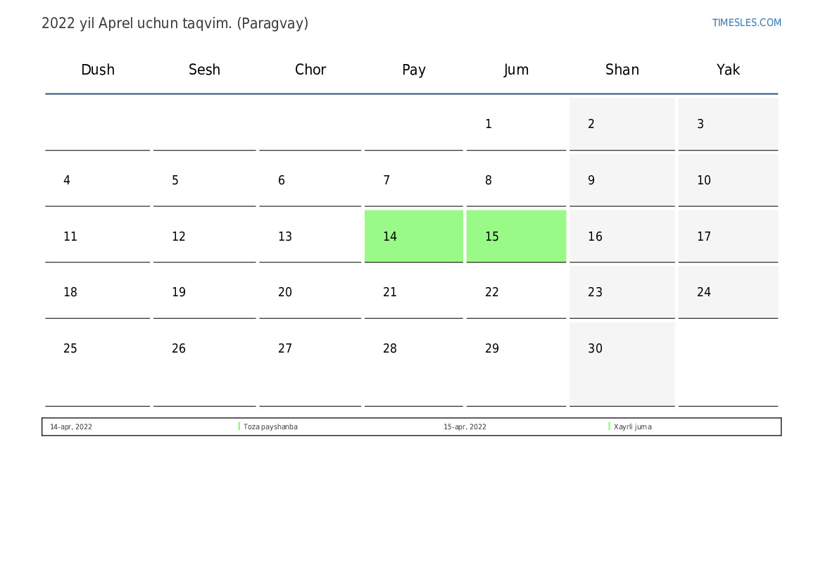 Paragvay uchun 2022 yil Aprel uchun ta'til va dam olish kunlari taqvimi
