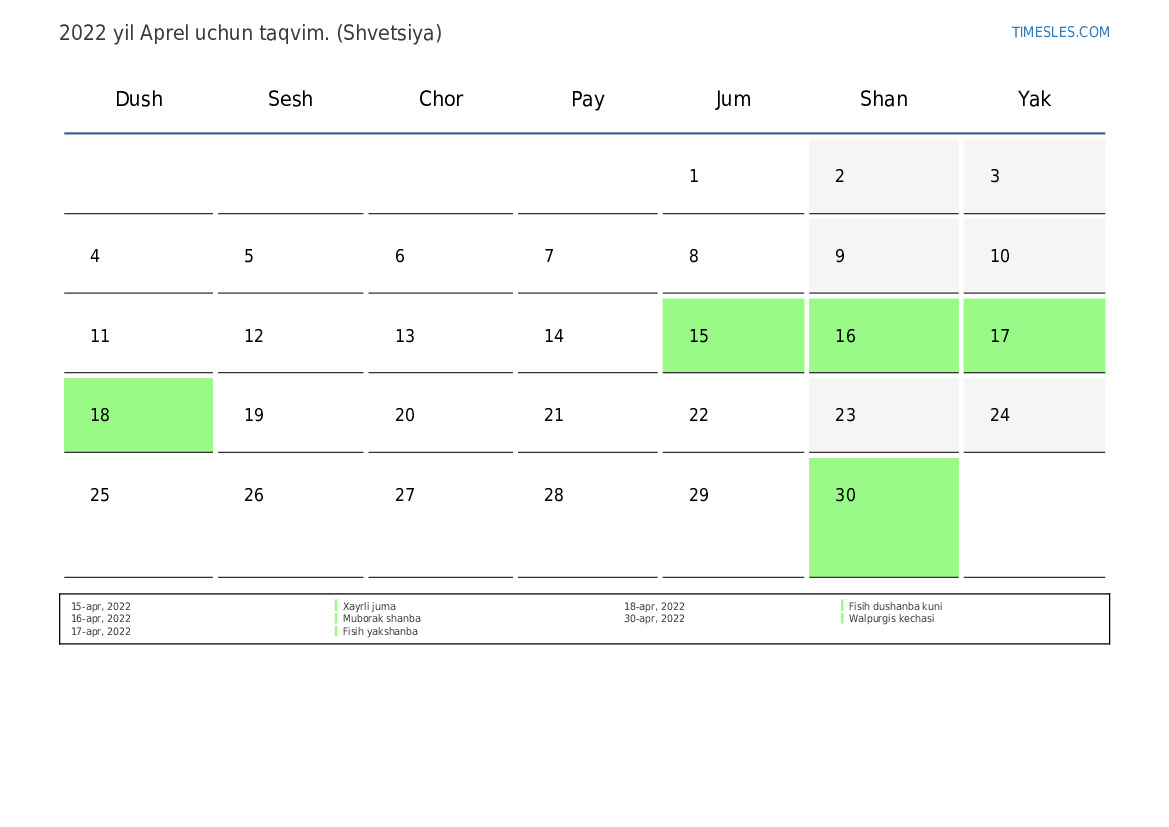 Shvetsiya uchun 2022 yil Aprel uchun ta'til va dam olish kunlari taqvimi
